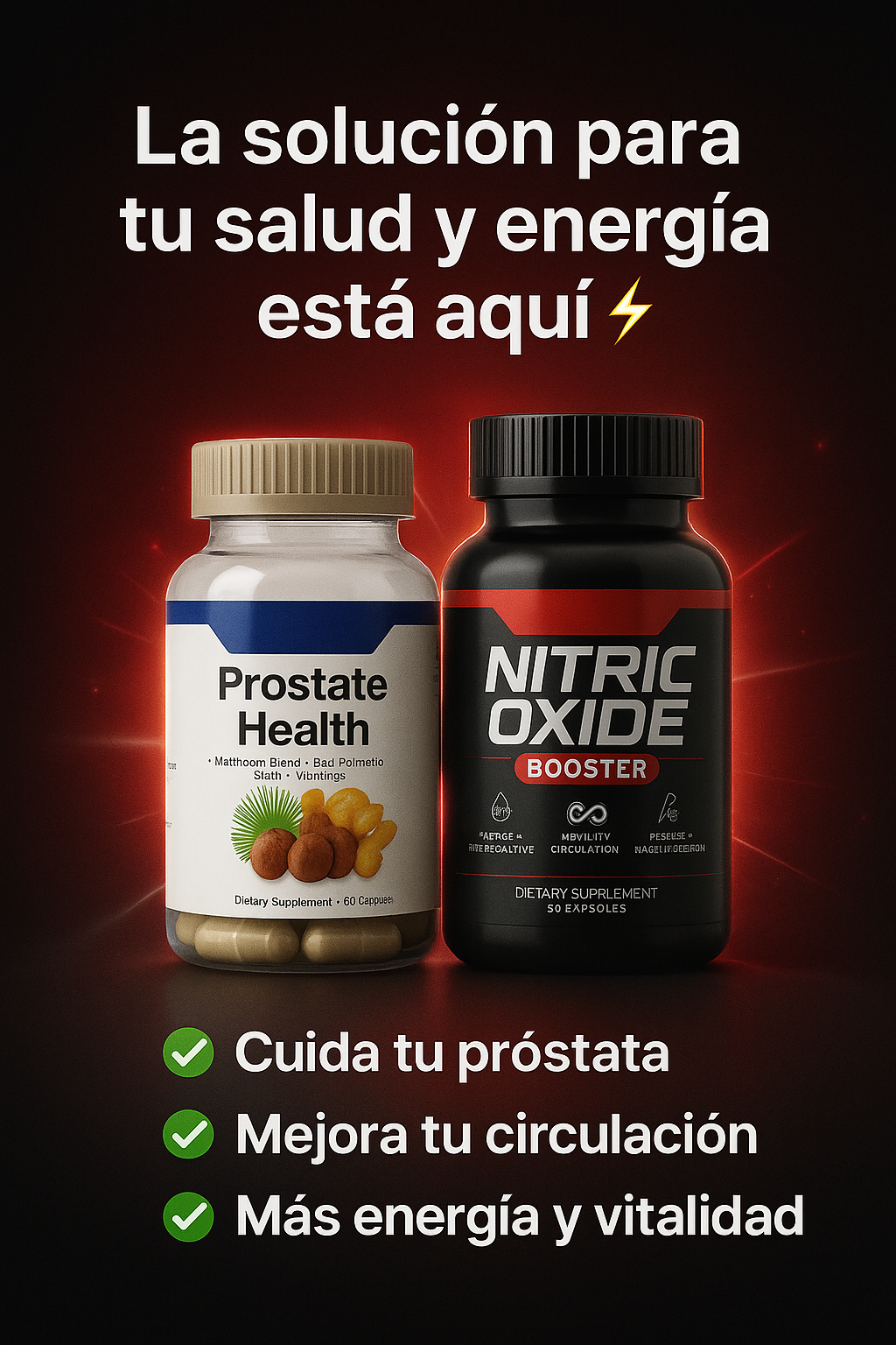 Prostate Health protege la próstata y regula la función urinaria; Nitric Oxide mejora la circulación y la oxigenación muscular. Juntos te dan salud + energía.